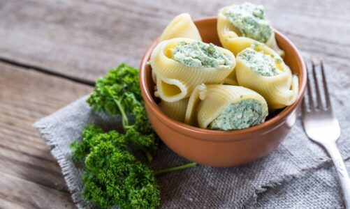 - Zdejmij z ognia, dodaj 3/4 sera, szpinak i przyprawy. Wystudź mieszankę.